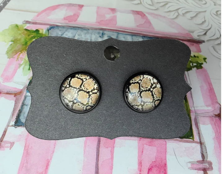 Brown Snake Skin Cabachon Black Bezel Earrings- 12 mm ONLY!